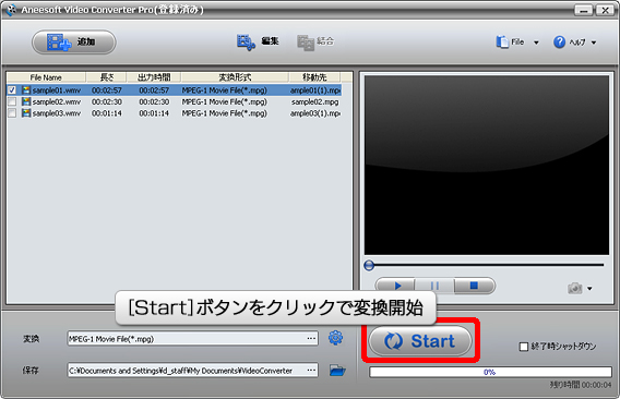 5. 変換したい動画にチェックが入っているのを確認し、画面右下にある[Start]ボタンをクリックすると変換が開始されます。
