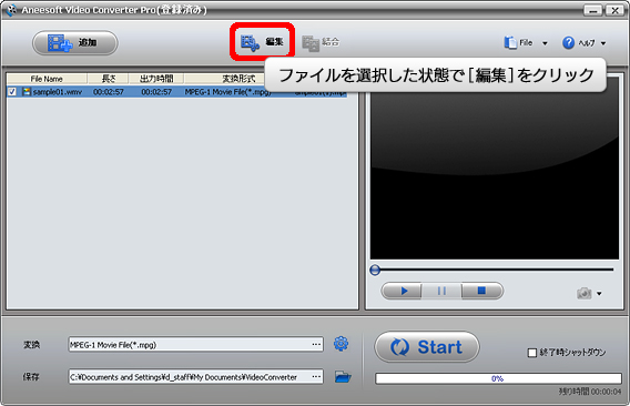 ファイルをクリックして選択した状態で[編集]をクリックすると、動画編集画面が開きます。