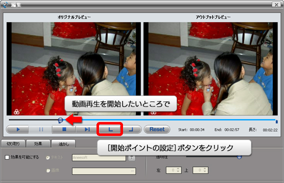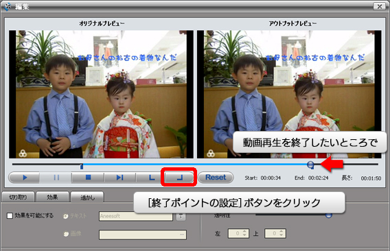 動画の開始点と終了点を設定して、動画のトリミングを行います。