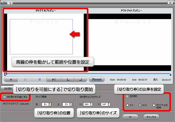 [切り取りを可能にする]にチェックを入れると、オリジナルプレビューの画面に青い切り取り枠が表示されます。