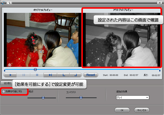 [明るさ]、[コントラスト]、[追加の効果]を変更した映像は、再生しながら画面右側の[アウトプットプレビュー]で確認することができます。