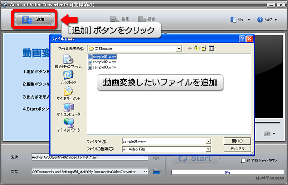 1. 画面左上の[追加]ボタンまたは画面右上の[File]メニューの[ファイルの追加]をクリックして、変換する動画ファイルを選択して追加します。