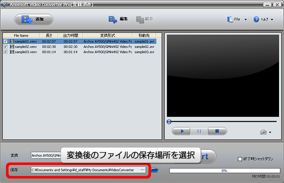 4. 画面下部にある[保存]の項目で、変換後のファイルを保存する場所を設定します。
