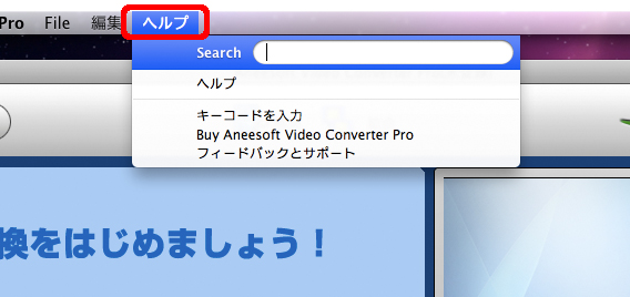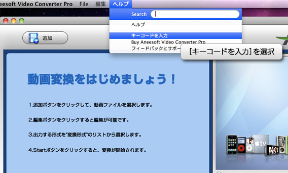 [ヘルプ]メニューから[キーコードを入力]を選択して登録画面を開き、シリアル番号を入力して登録します。