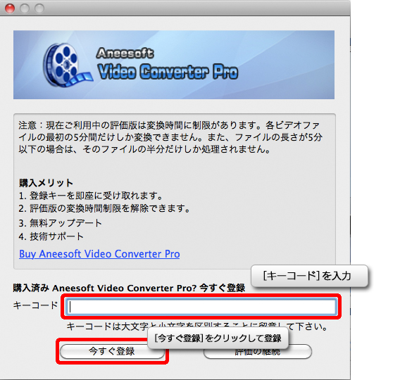 キーコード・・・シリアル番号入力欄。購入されたシリアル番号を入力してください。