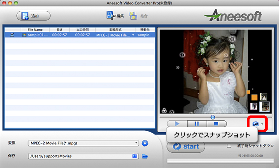 再生をしている状態でカメラアイコンのボタンをクリックすると、そのタイミングでスナップショットを撮ります。
