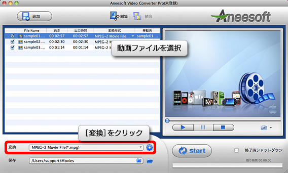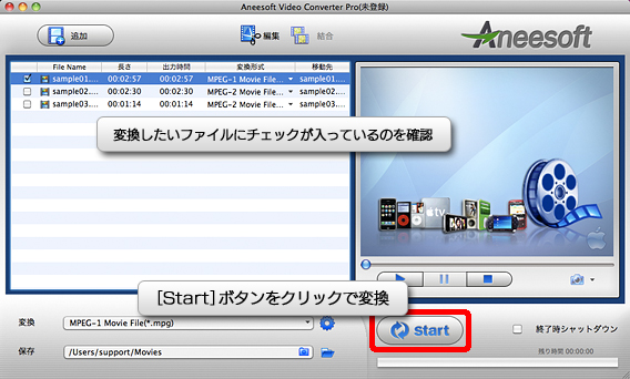 5. 変換したい動画にチェックが入っているのを確認し、画面右下にある[Start]ボタンをクリックすると変換が開始されます。