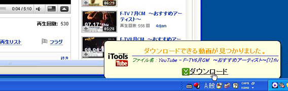 2. ブラウザ(Internet Explorer、FireFox、OPERAなど)でダウンロード可能な動画の再生が開始されると、ダウンロードバルーンが表示されます。※一部対応していないブラウザもあります。