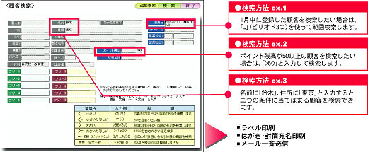 | 登録した顧客情報をもとに、宛名ラベルを印刷できます。顧客の選択は、条件を指定してボタンを押すだけの簡単検索!誰でもあっというまにラベル印刷ができます。もちろんはがきや封筒への印刷も可能です。 |