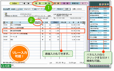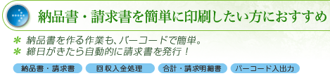 ■機能一覧 基本設定/得意先登録/商品登録/バーコード作成機能(JAN-8、JAN-13、ITF、NW7)/見積伝票/売上伝票/売掛入金伝票/出庫伝票/請求書(合計請求書、請求明細書)/得意先入力パネル/商品入力パネル/バーコード商品入力/商品データ取込み、書出し/得意先データ取込み、書出し/バックアップ実行/バックアップ復帰/ファイル修復